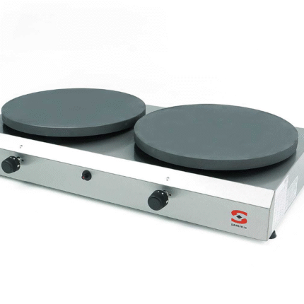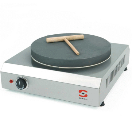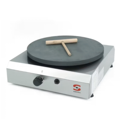 Crepera a gas simple con 1 placa de Ø 400 mm. Fabricada en acero inoxidable. Superficie de la placa de hierro colado