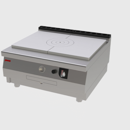 Superficie de cocción de acero laminado de 20 mm. de espesor con peto perimetral en acero inoxidable y canal recoge grasas. En enl frontal de mandos está situado el cajón recoge grasas extraíble de gran capacidad.