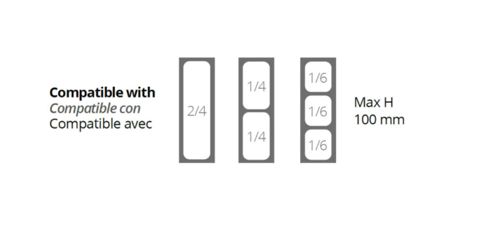 - Capacidad 1 GN 2/4, 2 GN 1/4 o 3 GN 1/6 con una profundidad máxima de 10 cm (no incluidas).