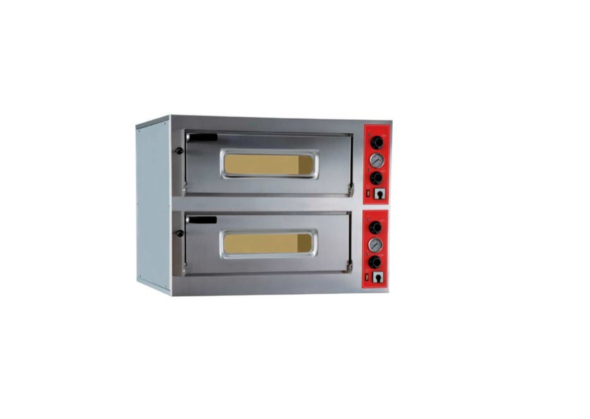 Horno de pizza con doble cámara. Superficie de cocción con ladrillo refractario. Resistencias en parte superior e inferior. Frente, sobre y puertas con cristal en acero inox. Termómetro analógico, luz interior y aislamiento térmico con lana de roca. Interruptor puesta en marcha. Temperatura de trabajo: 400 ºc máx. Potencia absorbida: 11,2 kw. Alimentación: 400 V trifásico. Dimensiones de la cámara: 700x700x150 mm. Dimensiones externas: 990x920x680 mm. Capacidad de pizzas por cámara: 4 x 33 cm / 1 x 45 cm o 1 de 60×40 cm.